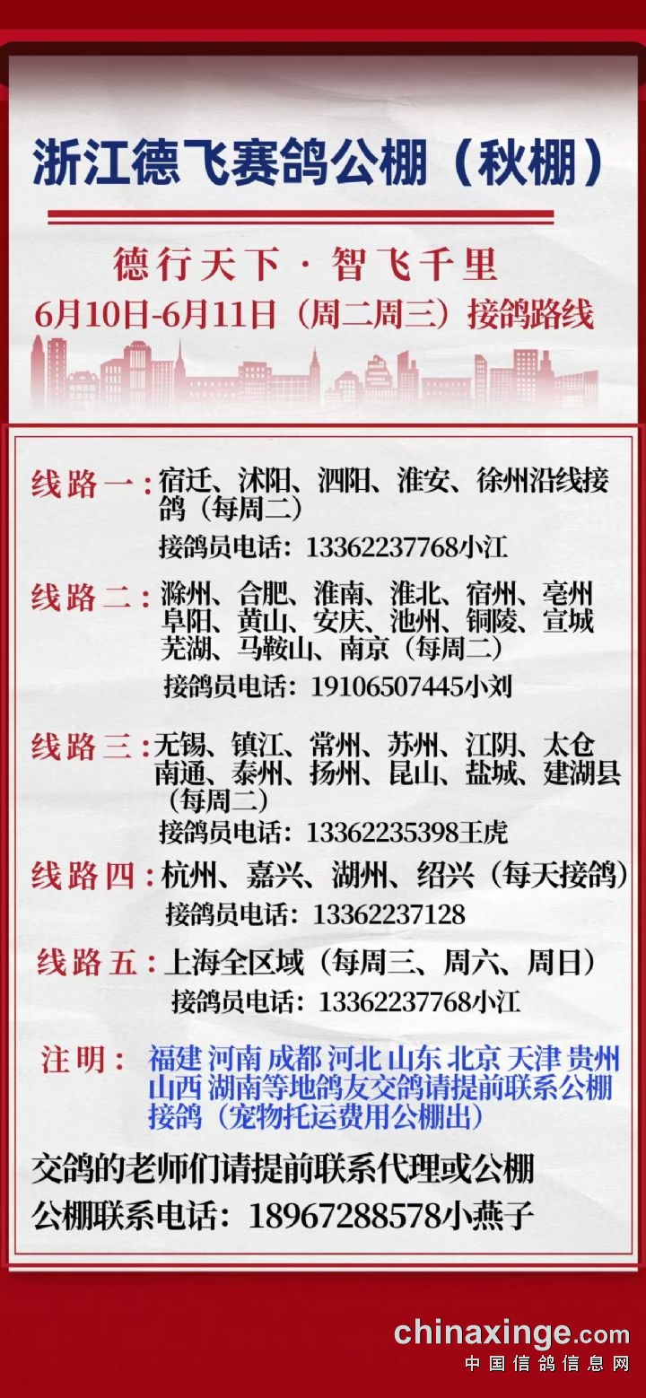 浙江德飞赛鸽秋棚6月10日-6月11日接鸽公告