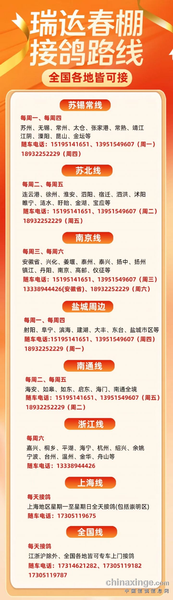江苏瑞达接鸽路线详情
