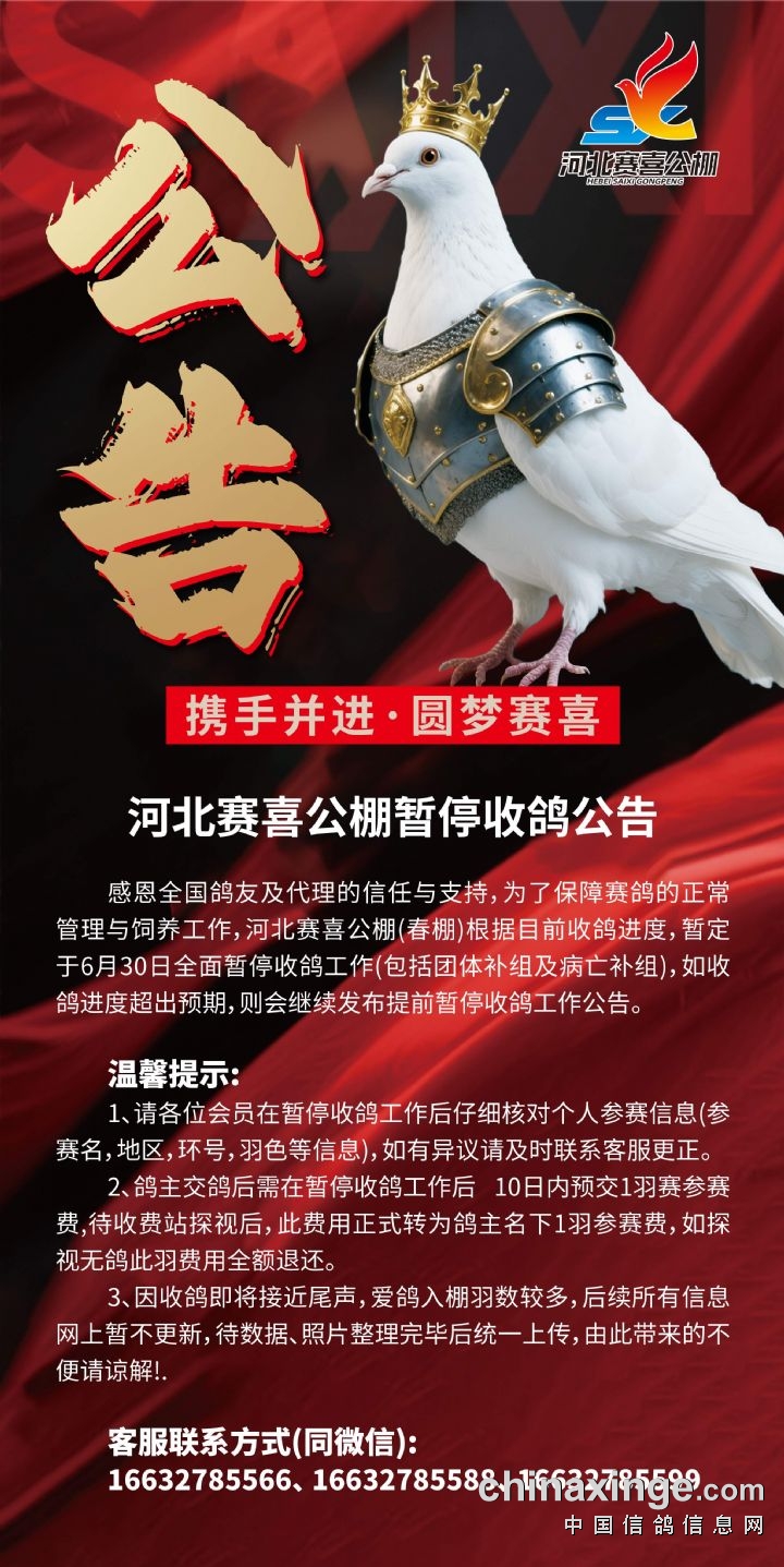 赛喜(春棚):2025年赛喜公棚暂停收鸽公告