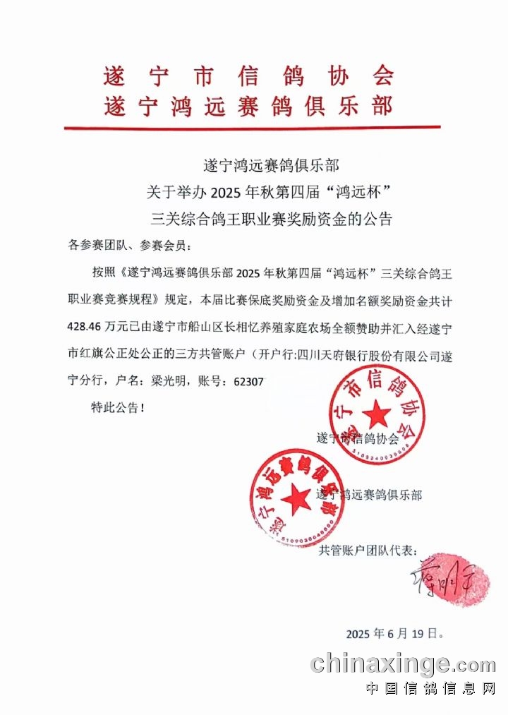 关于举办2025年秋第四届“鸿远杯” 三关综合鸽王职业赛奖励资金的公告
