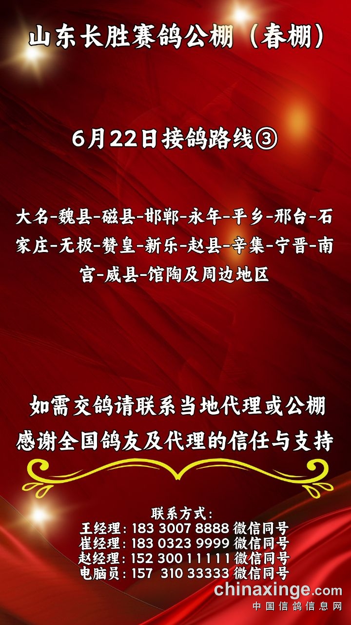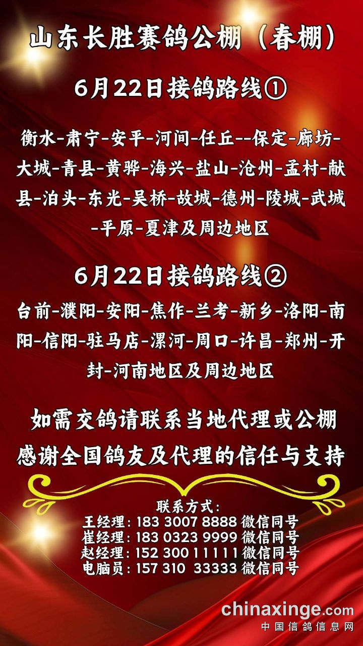 山东长胜赛鸽公棚(春棚)6月22日接鸽路线