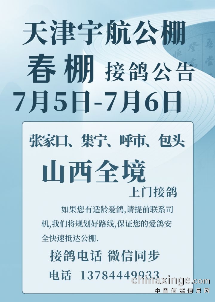 天津宇航公棚7月5-7月6日前往山西、张家口、呼市、集宁、包头沿途上门接鸽
