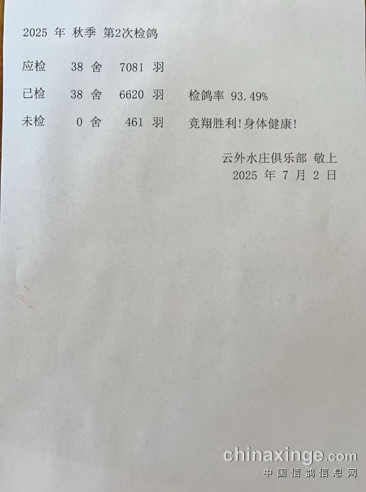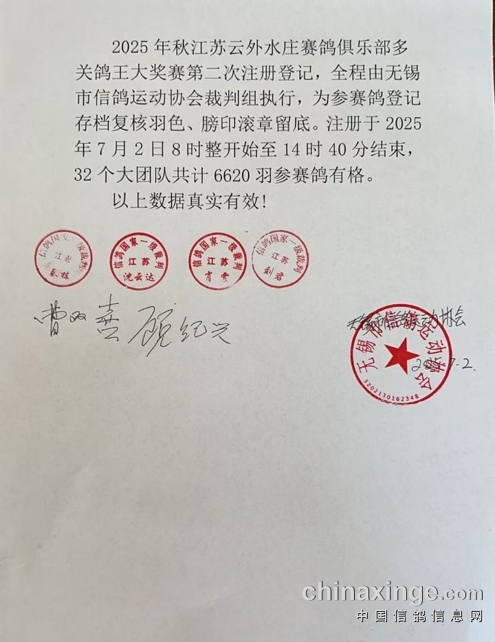 2025年秋江苏云外水庄赛鸽俱乐部多关鸽王大奖赛第二次注册登记,全程由无锡市信鸽运动协会裁判组执行,为参赛鸽登记存档复核羽色、膀印滚章留底。注册于2025年7月2日8时整开始至14时40 分结束,32个大团队共计6620羽参赛鸽有格。