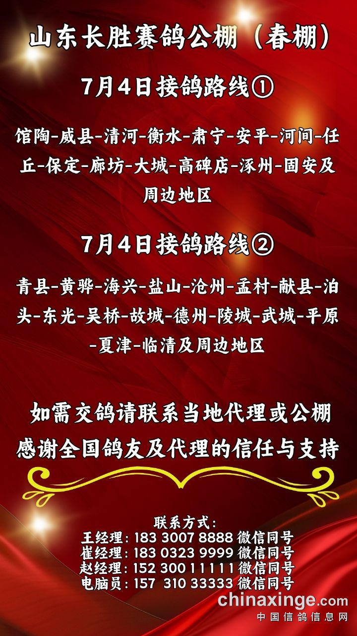 山东长胜赛鸽公棚(春棚)7月4日接鸽路线