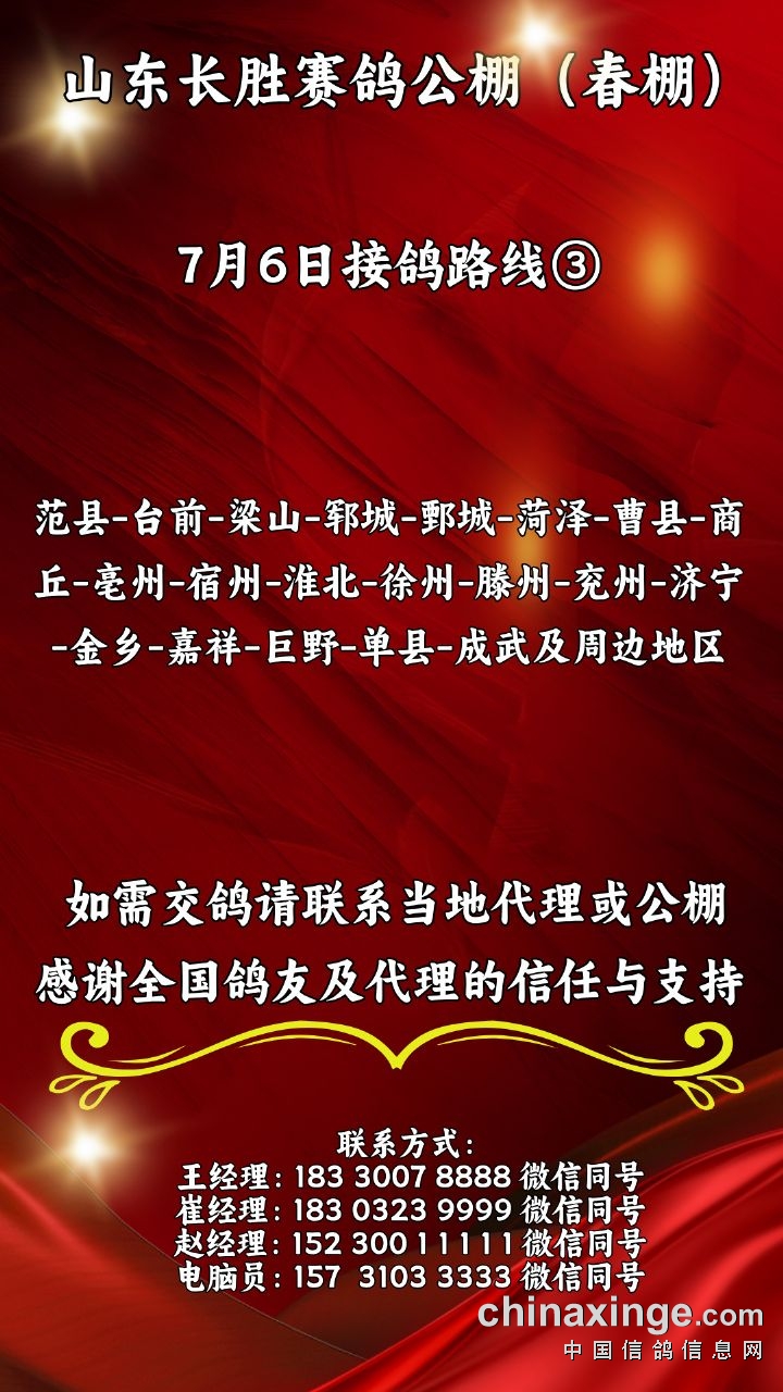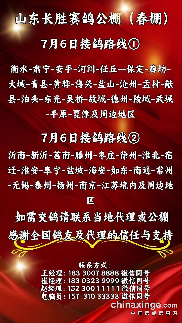 山东长胜赛鸽公棚(春棚)7月6日接鸽路线