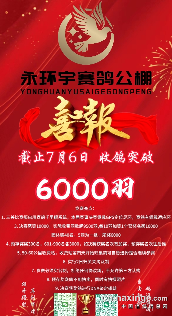 广东永环宇赛鸽公棚,第十一届截止7月6日收鸽羽数已突破6000羽,感谢广大鸽友会员的支持与信任!