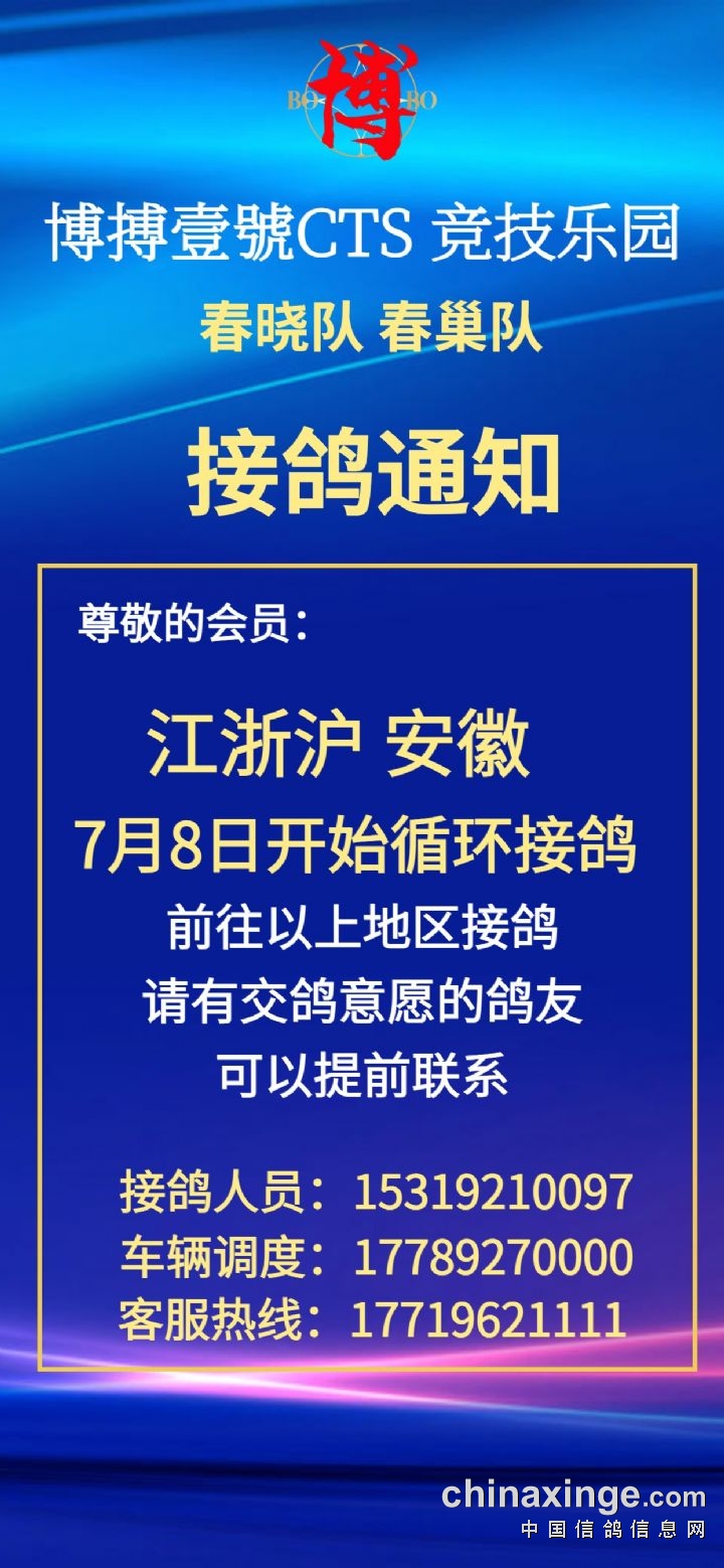 博搏壹號春晓队江浙沪、安徽7月8日开始循环接鸽公告