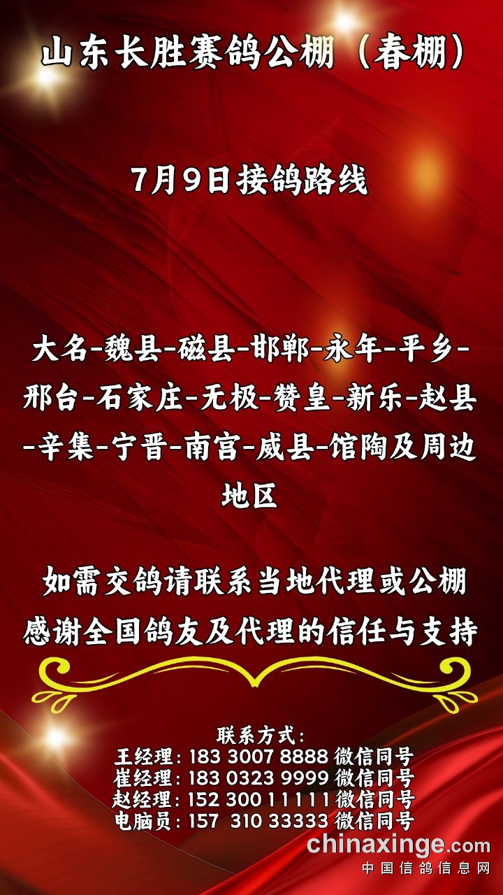山东长胜赛鸽公棚(春棚)7月9日接鸽路线
