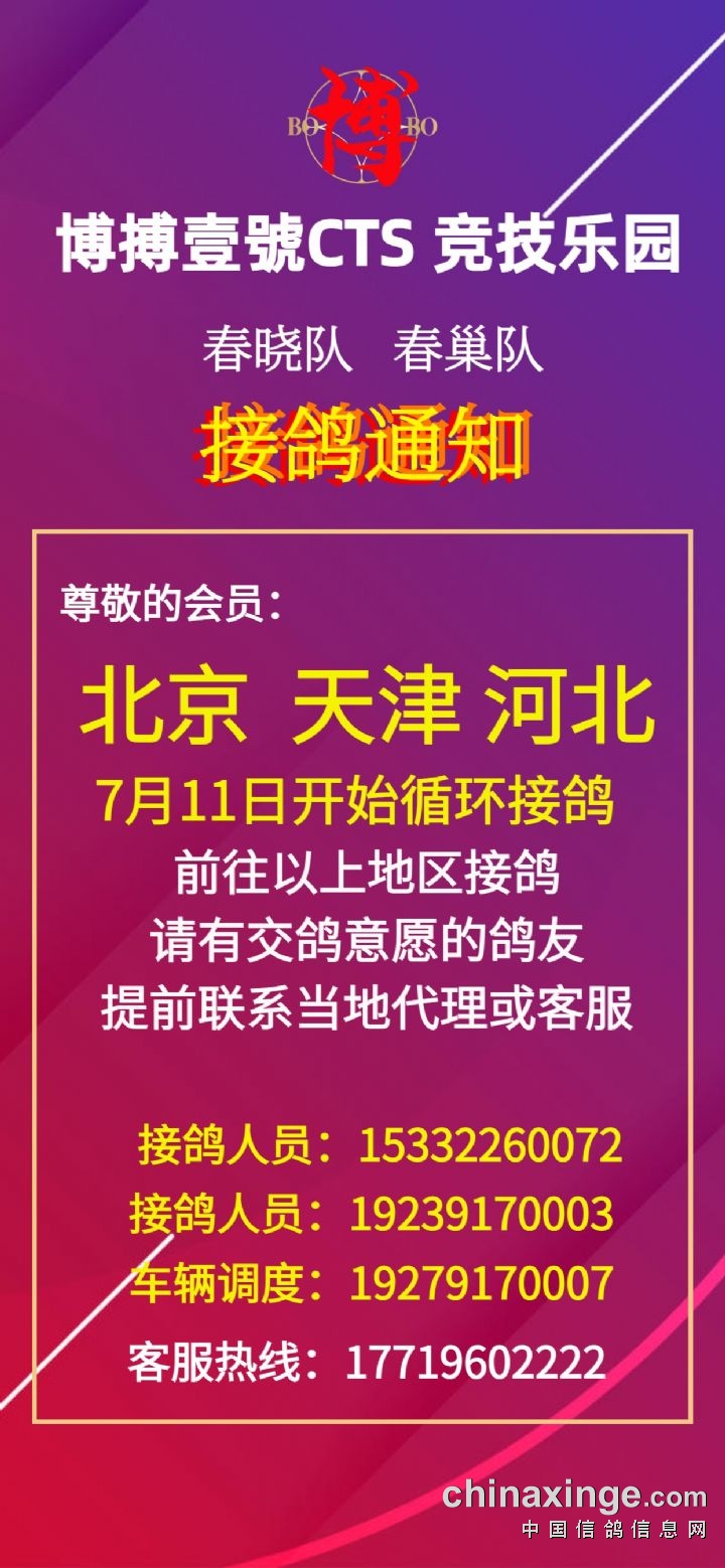 博搏壹號春晓队北京、天津、河北7月11日开始循环接鸽公告