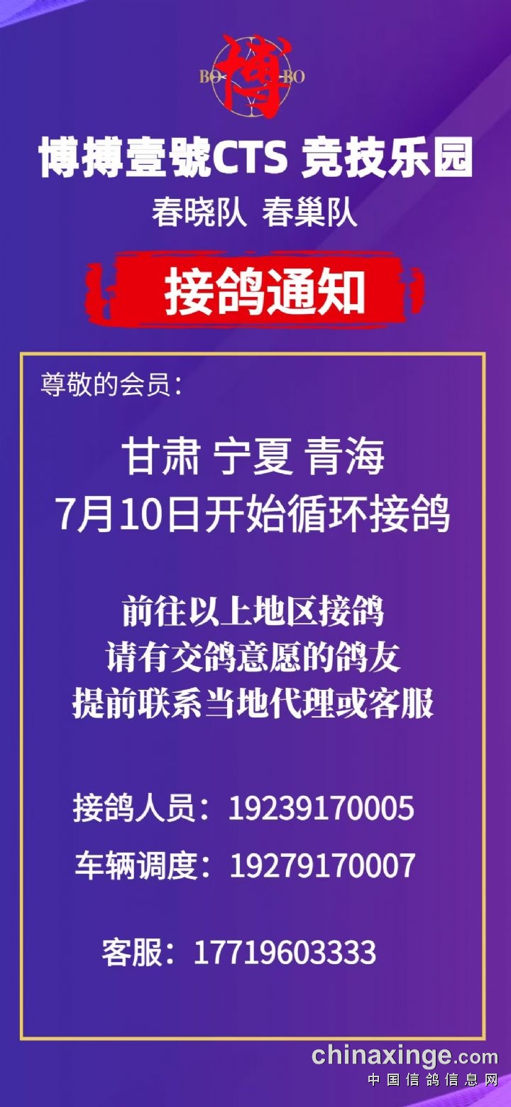 博搏壹號春晓队甘肃、宁夏、青海7月10日开始循环接鸽公告