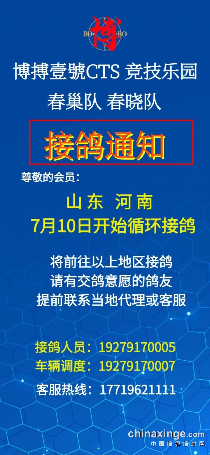 博搏壹號春晓队山东、河南7月10日开始循环接鸽公告