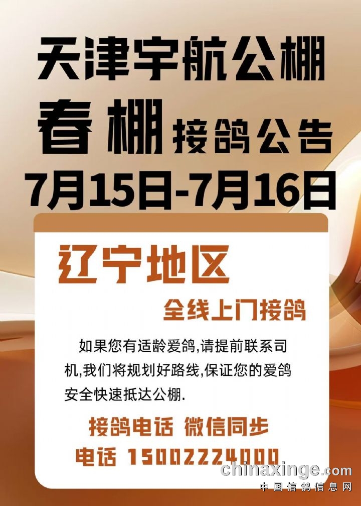 天津宇航公棚7月15日-16日前往辽宁地区全线上门接鸽