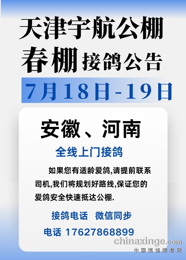 天津宇航公棚7月18-19日前往安徽 河南地区全线上门接鸽