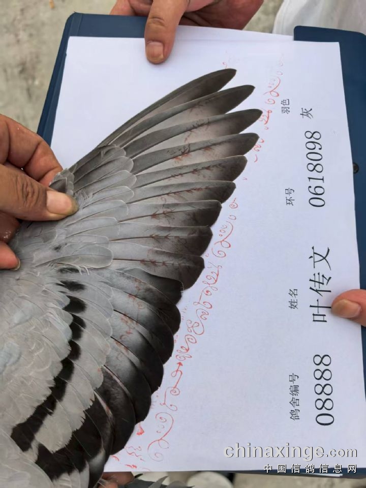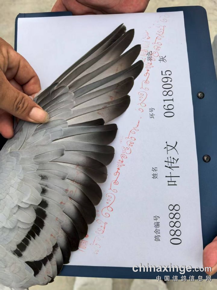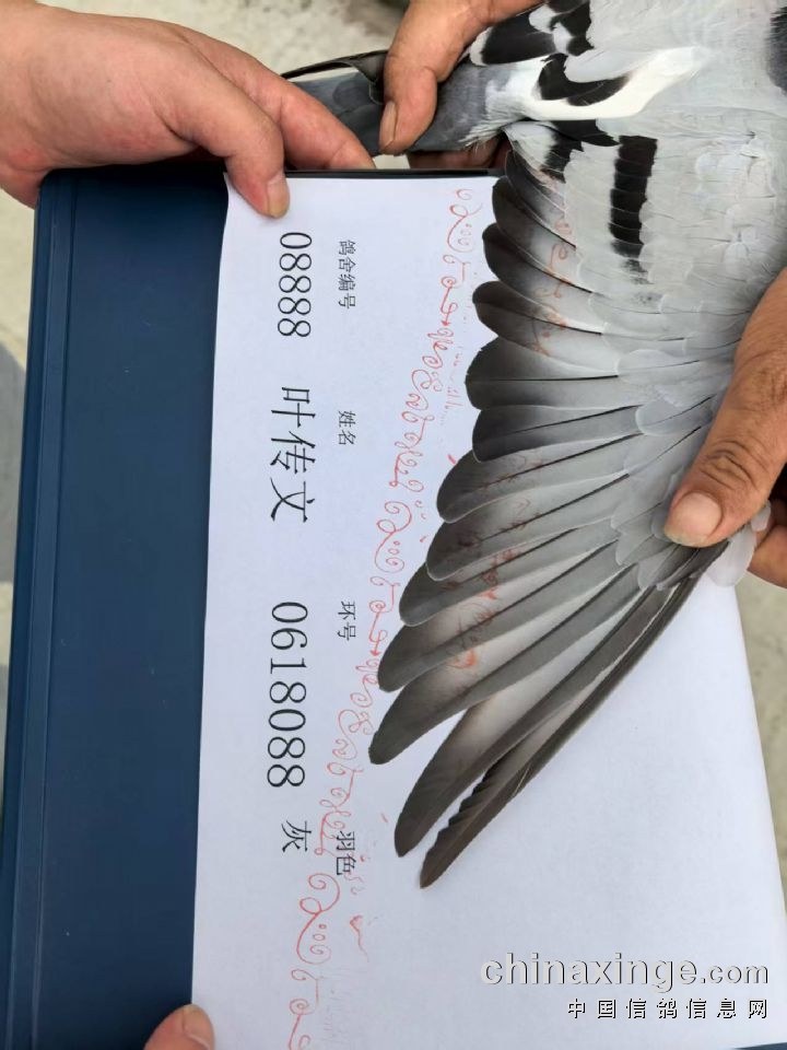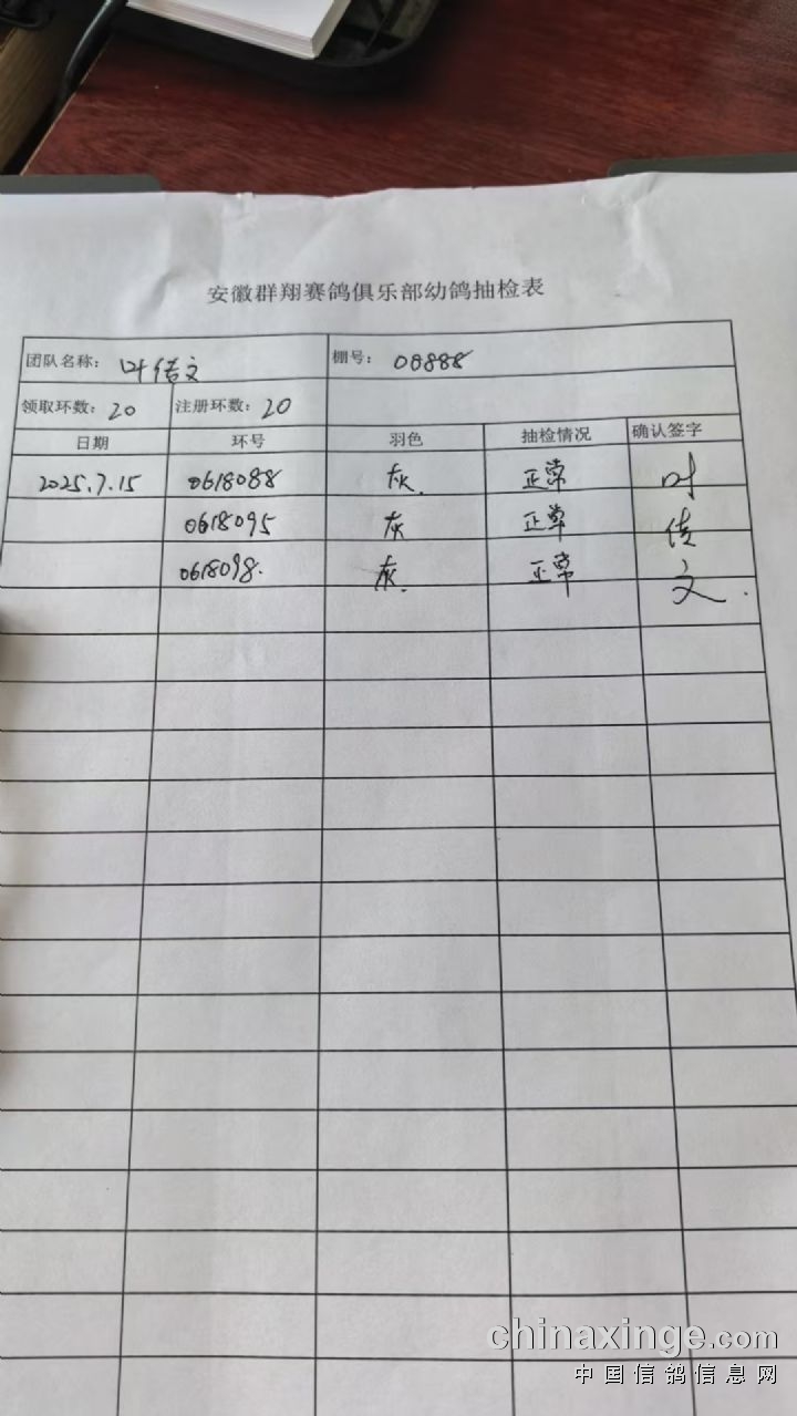 08888-叶传文,拿环20枚,已注册20羽。今日抽检3羽,均合格。