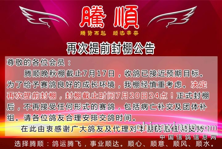 腾顺公棚再次提前封棚公告-截止7月20日已封棚