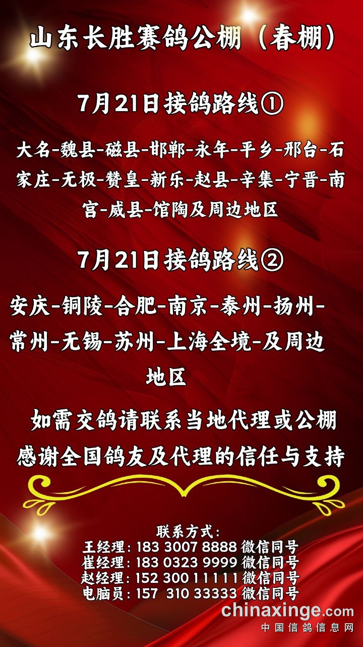 山东长胜赛鸽公棚(春棚)7月21日接鸽路线