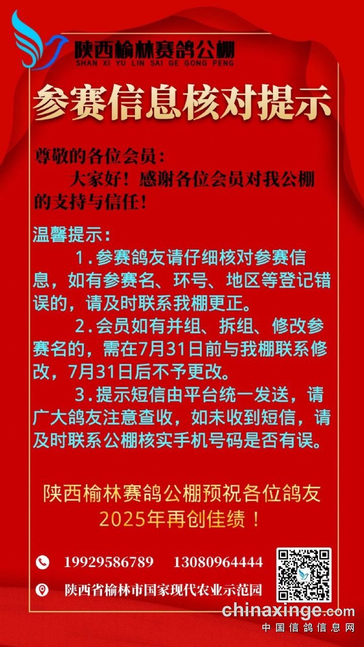 陕西榆林赛鸽公棚参赛信息核对提示