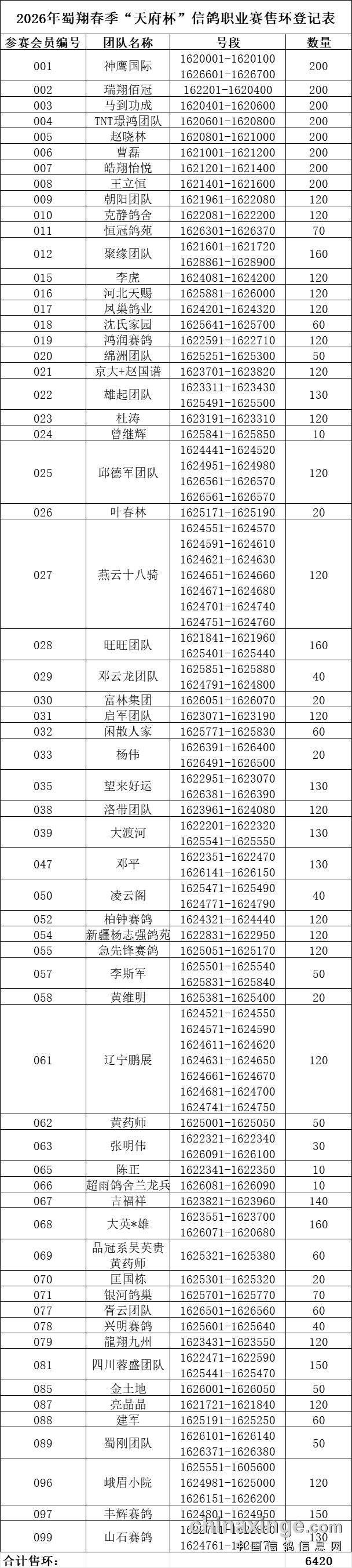四川蜀翔职业赛鸽俱乐部2026年蜀翔春季“天府杯”信鸽职业赛售环工作已结束。在全国鸽友的鼎力支持下,本届共发售足环6420枚,名额共计422名。各参赛团队或参赛者具体购环数量及环号详见下表。(特别提示:凡不在此表内对应的号段和号码无2026蜀翔春季四关职业赛参赛资格!)