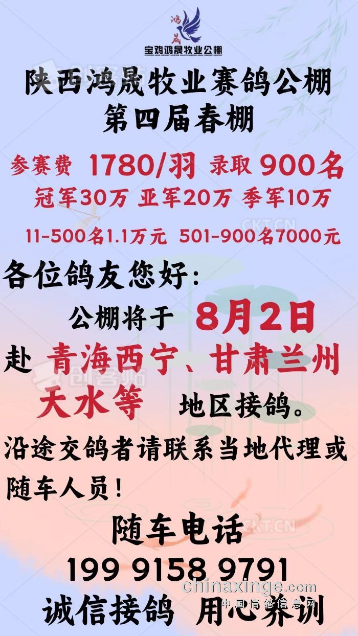 8月2日青海西宁、甘肃兰州、天水接鸽公告