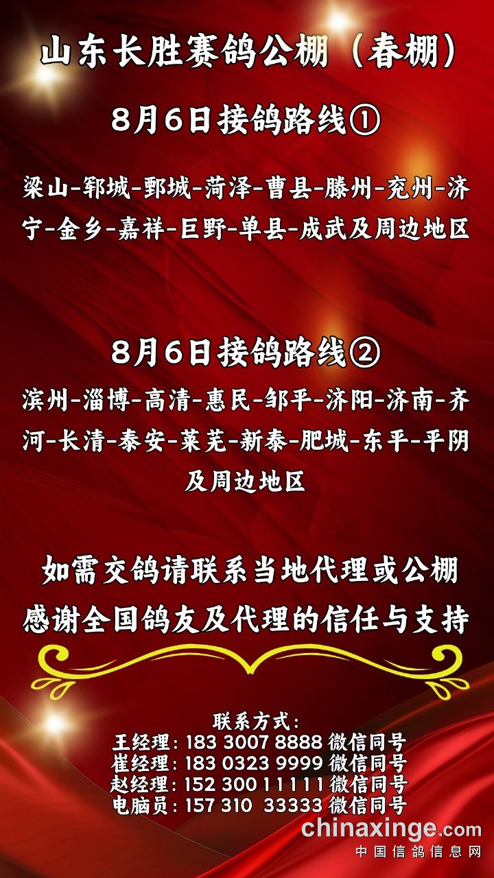 山东长胜赛鸽公棚(春棚)8月6日接鸽路线