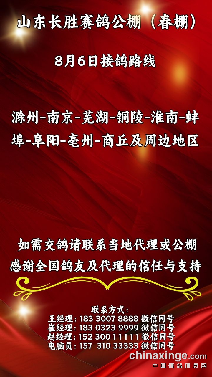 山东长胜赛鸽公棚(春棚)8月6日接鸽路线
