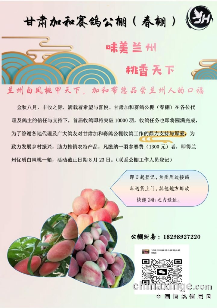 金秋八月,丰收之际,满载着希望与喜悦。甘肃加和赛鸽公棚(春棚)在各位代理及鸽主的信任与支持下,首届收鸽即将突破10000羽,收鸽任务也即将圆满完成,为了答谢各地代理及广大鸽友对甘肃加和赛鸽公棚收鸽工作的鼎力支持与厚爱,为致力发展乡村振兴,助力推销农特产品,凡缴纳一羽参赛费(1300元)者,即🉐兰州优质白凤桃一箱,活动截止日期8月23日。