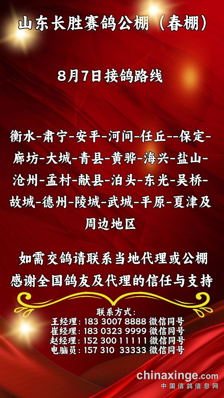 山东长胜赛鸽公棚(春棚)8月7日接鸽路线