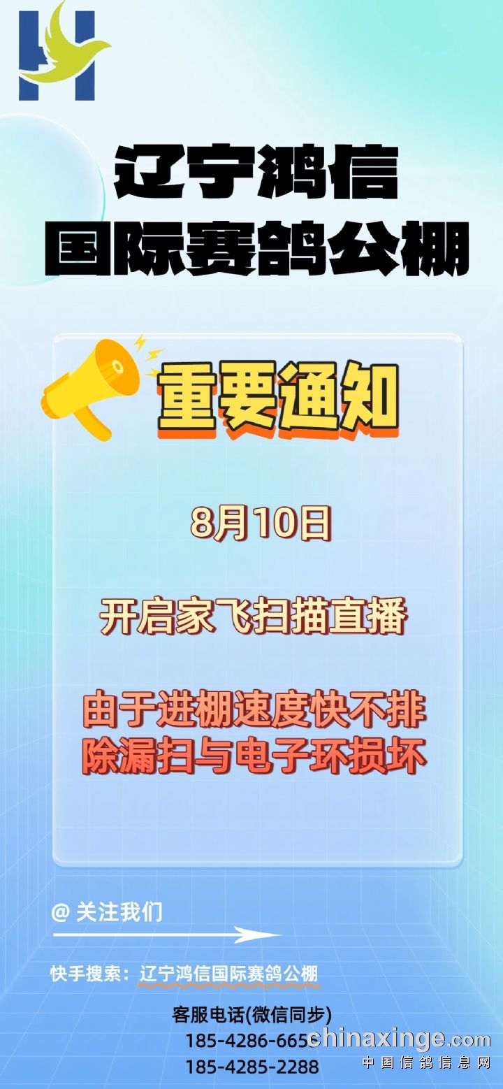 辽宁鸿信国际赛鸽公棚8月10日开启家飞直播扫描公告