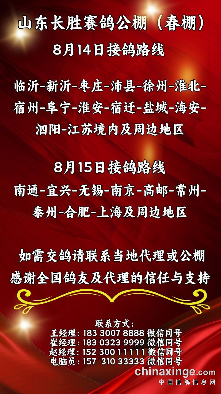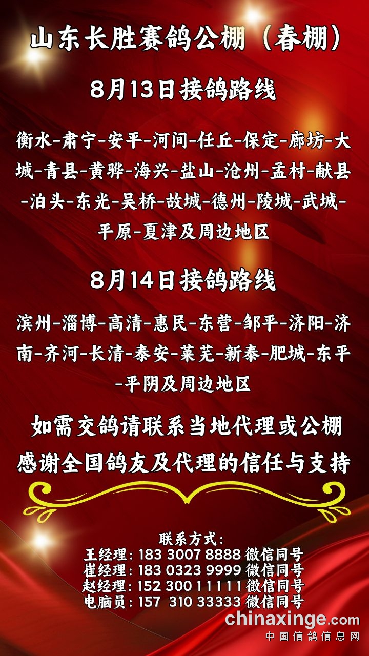 山东长胜赛鸽公棚(春棚)8月13日-15日接鸽路线