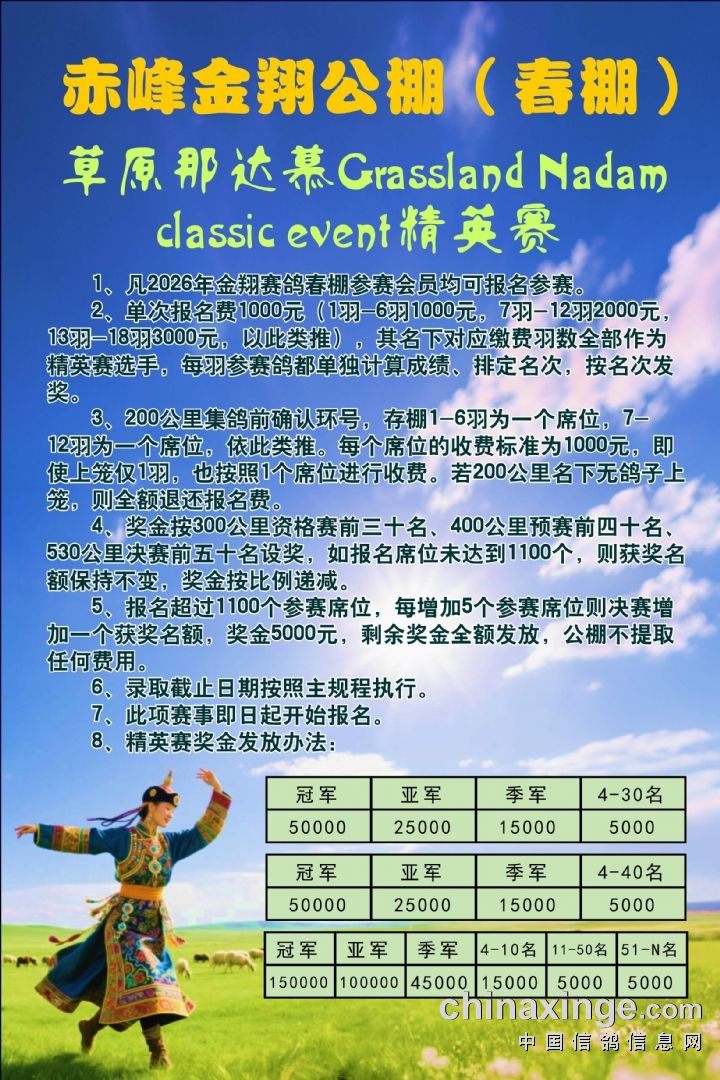 | 辽阔草原,激情赛事,这场汇聚各路赛鸽精英的盛会,将为每一位参与者带来独特的竞技体验。金翔赛鸽公棚以专业的赛事保障、公平公正的竞赛环境,诚邀您携爱鸽共赴草原之约,在那达慕的独特氛围中一竞高下。