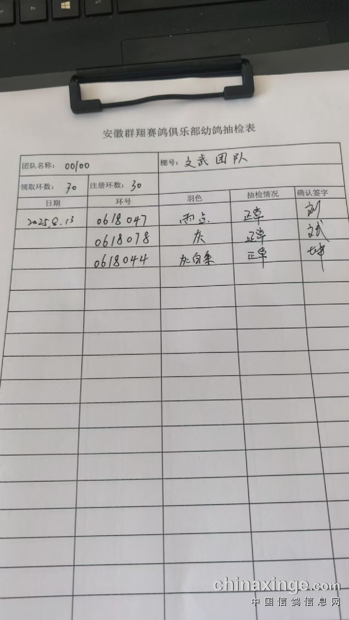00100-文武团队,拿环30枚,已注册30羽。今日抽检3羽,均合格。