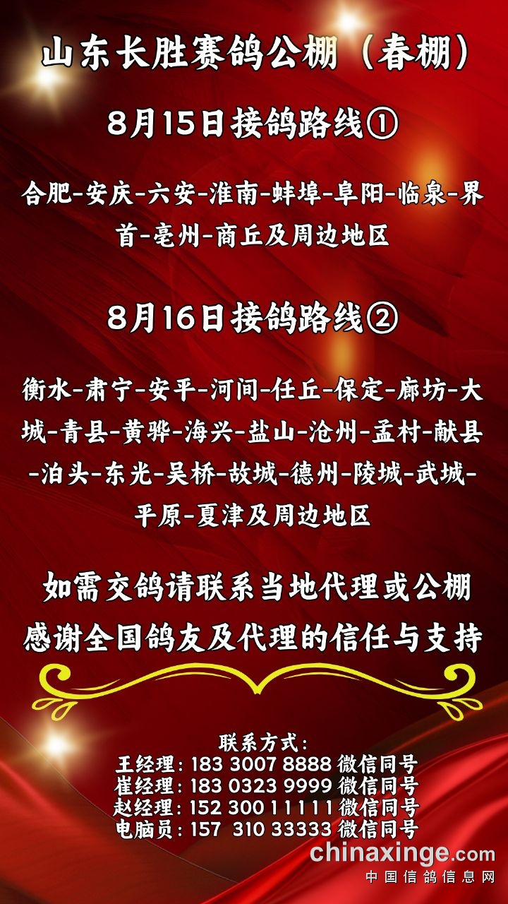 山东长胜赛鸽公棚(春棚)8月16日接鸽路线