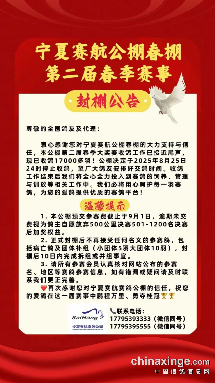 宁夏赛航赛鸽公棚封棚公告