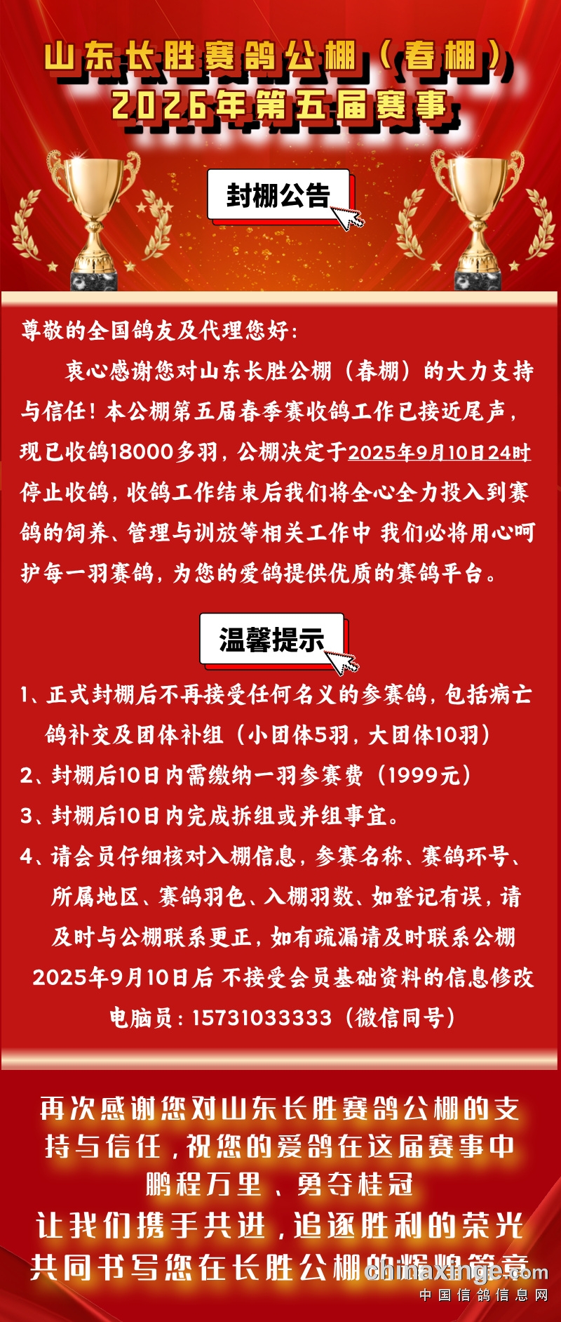 山东长胜赛鸽公棚(春棚)封棚公告