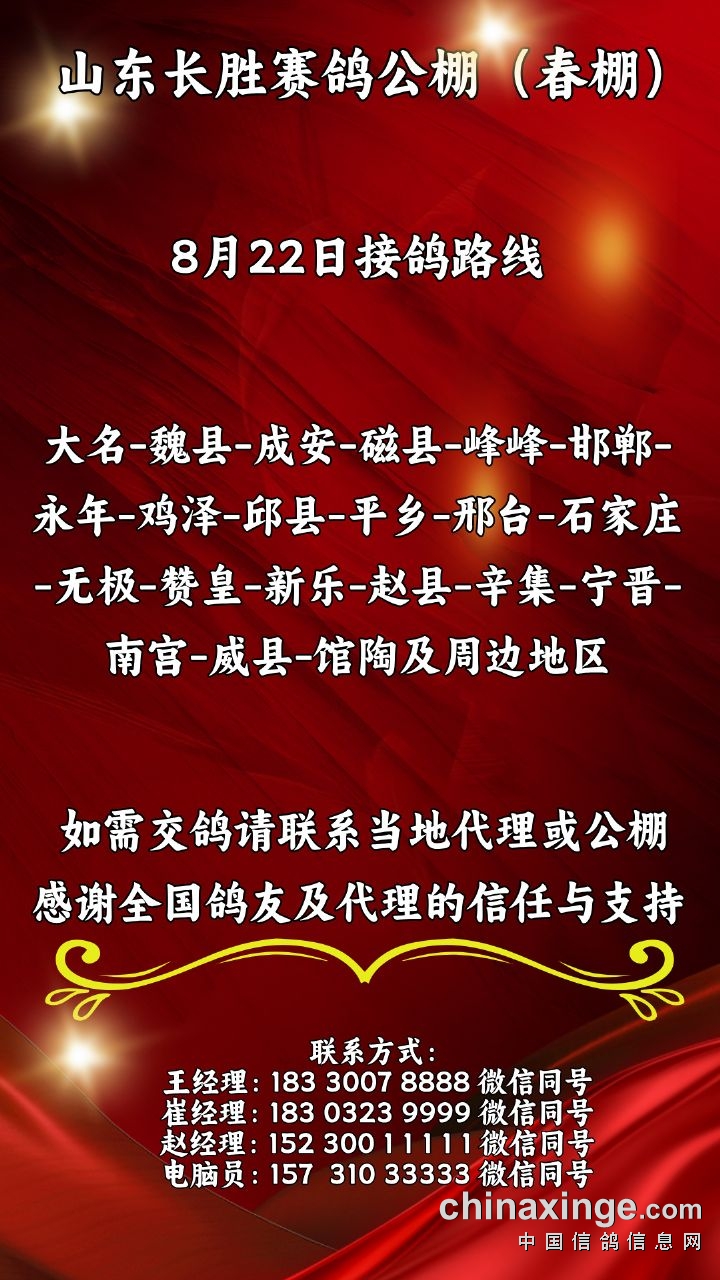 山东长胜赛鸽公棚(春棚)8月22日接鸽路线
