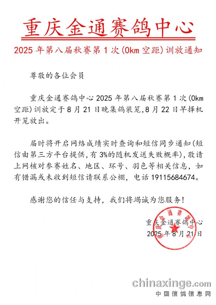 重庆金通2025年秋赛第1次(0km空距)训放通知