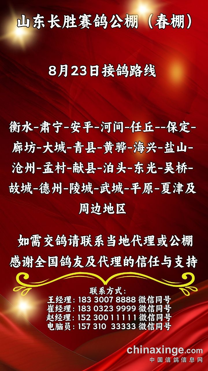 山东长胜赛鸽公棚(春棚)8月23日接鸽路线