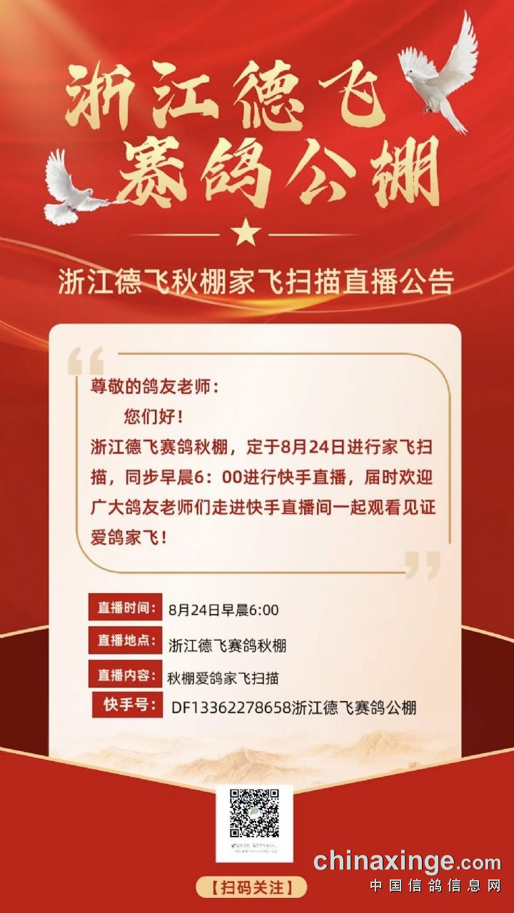 浙江德飞赛鸽公棚8月24日家飞扫描公告