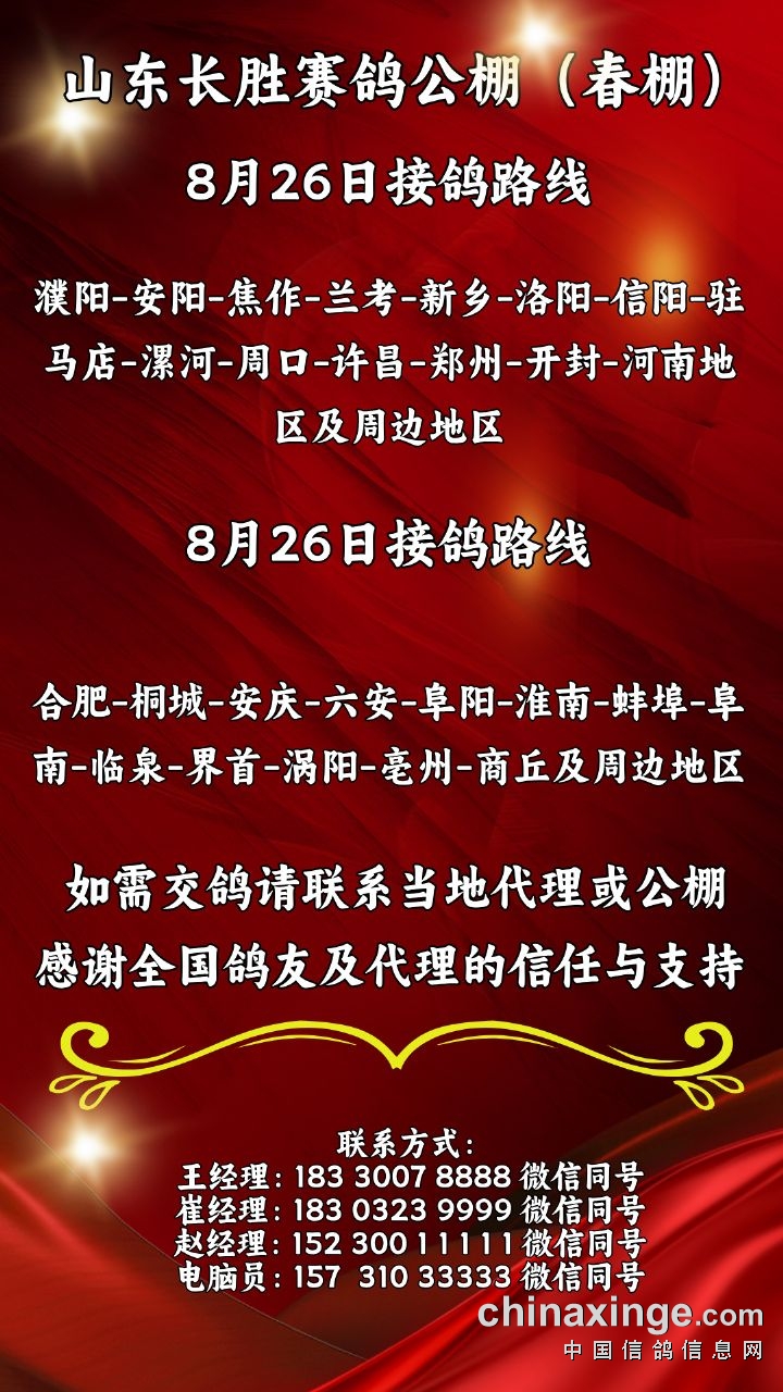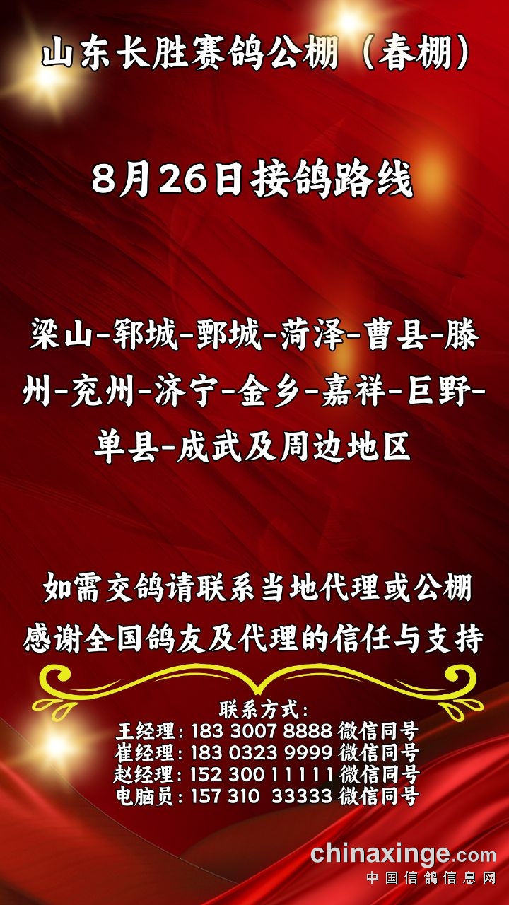 山东长胜赛鸽公棚(春棚)8月26日接鸽路线