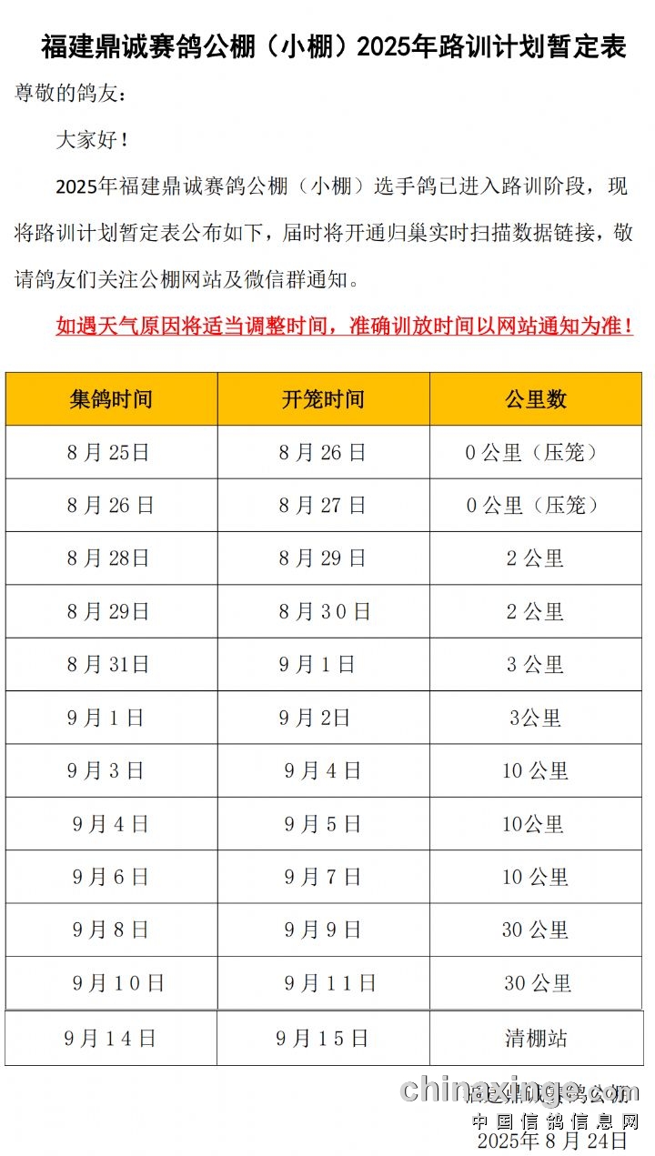 福建鼎诚赛鸽公棚(小棚)2025年路训计划暂定表