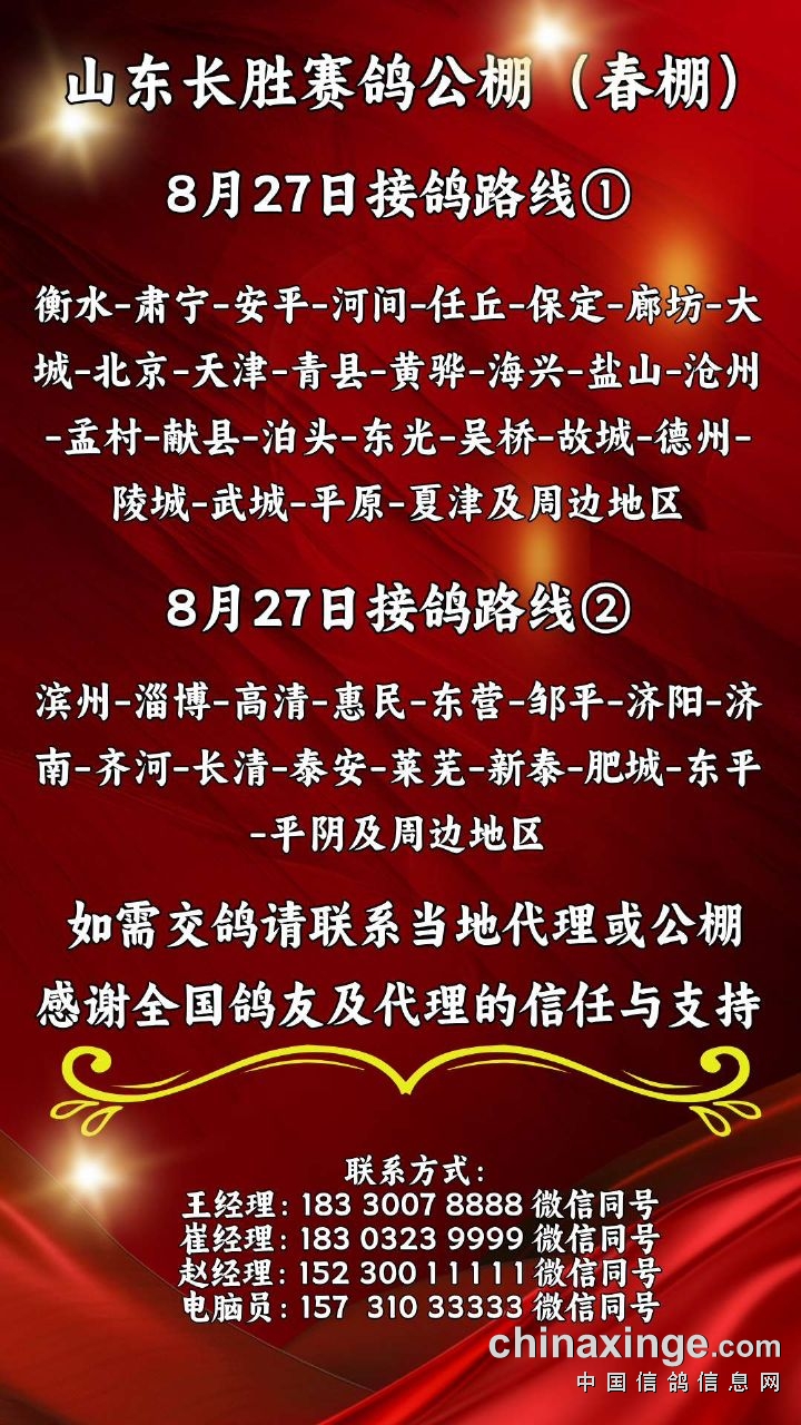 山东长胜赛鸽公棚(春棚)8月27日接鸽路线