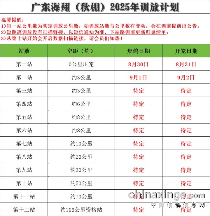 广东海翔(秋棚)第二站3公里训放定于20259月1日晚集鸽,9月2日早上开笼!如遇恶劣天气,则改期另行通知!