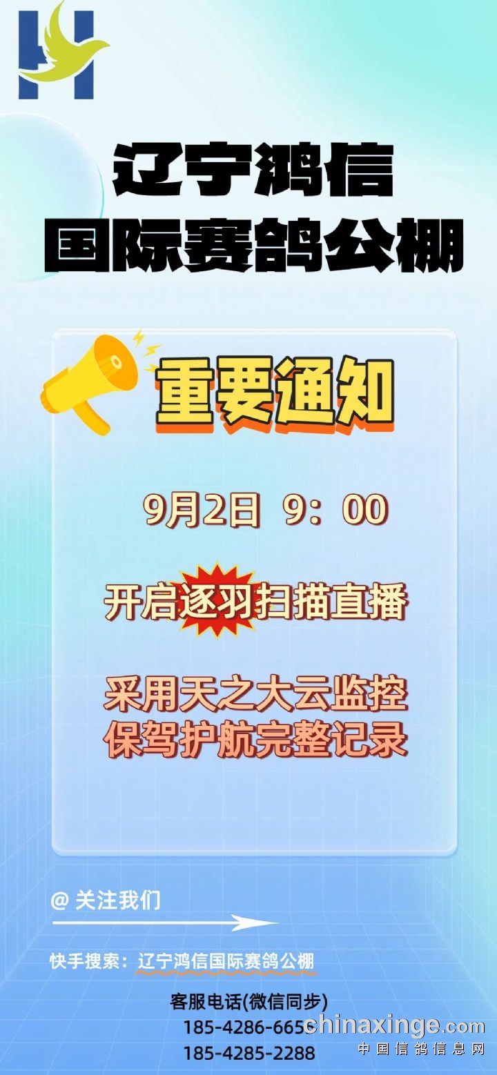辽宁鸿信国际赛鸽公棚9月2日开启逐羽扫描直播公告