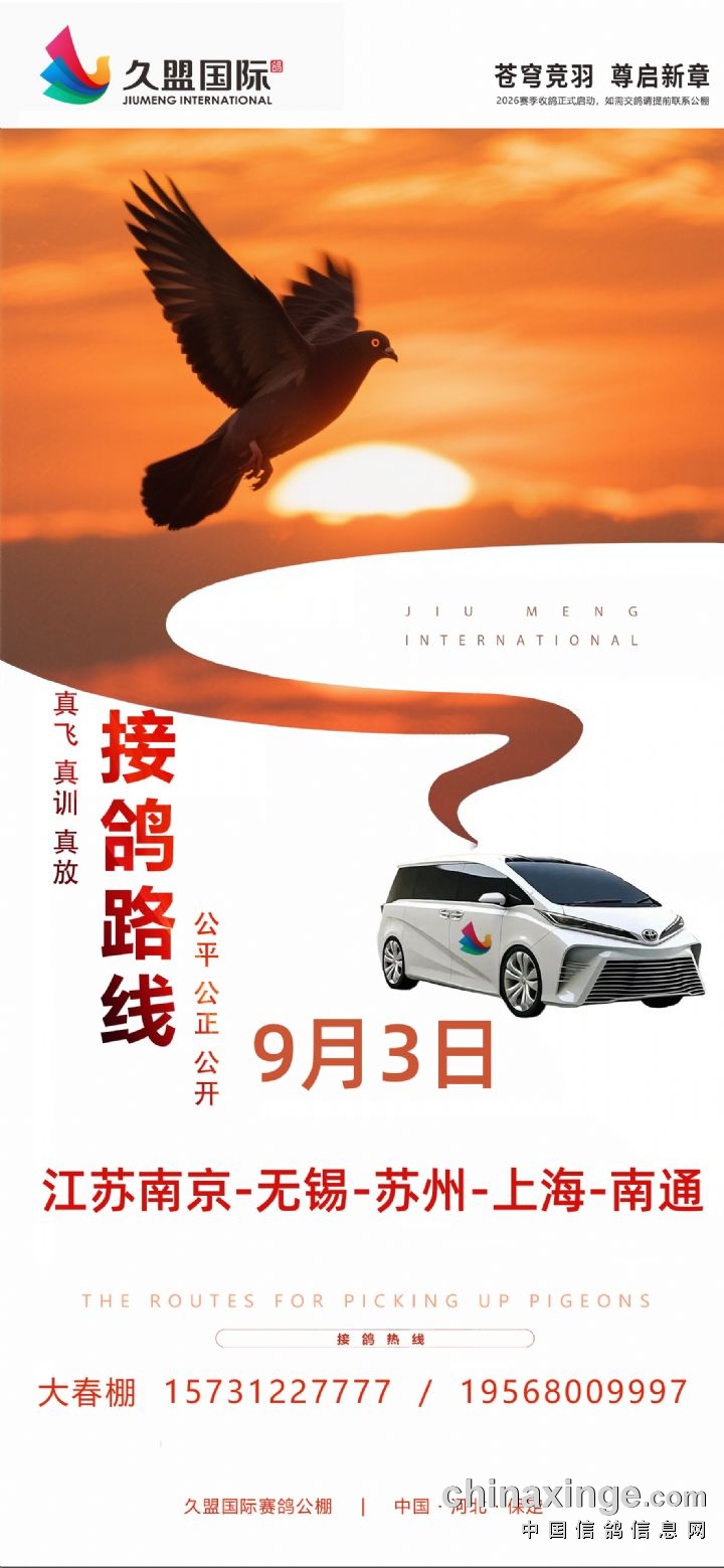 河北久盟国际赛鸽公棚(春棚)9月3日接鸽路线
