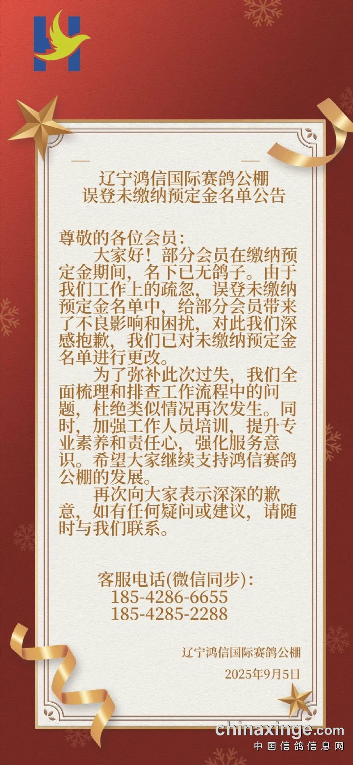 辽宁鸿信国际赛鸽公棚误登未缴纳预定金名单公告