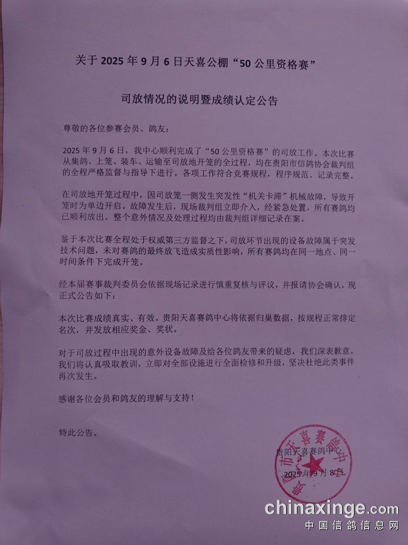 关于2025年9月6日天喜公棚:“50公里资格赛”司放情况的说明暨成绩认定公告