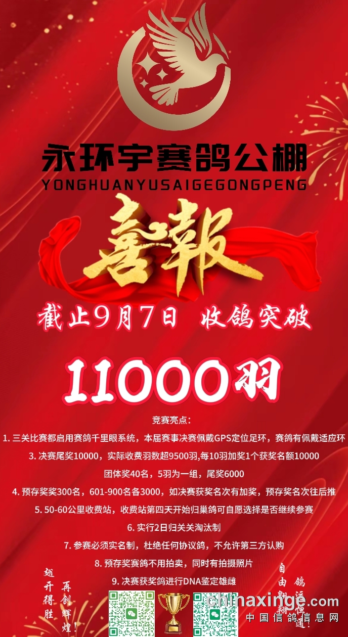 广东永环宇赛鸽公棚,第十一届截止9月7日收鸽羽数已突破11000羽,感谢广大鸽友会员的支持与信任!