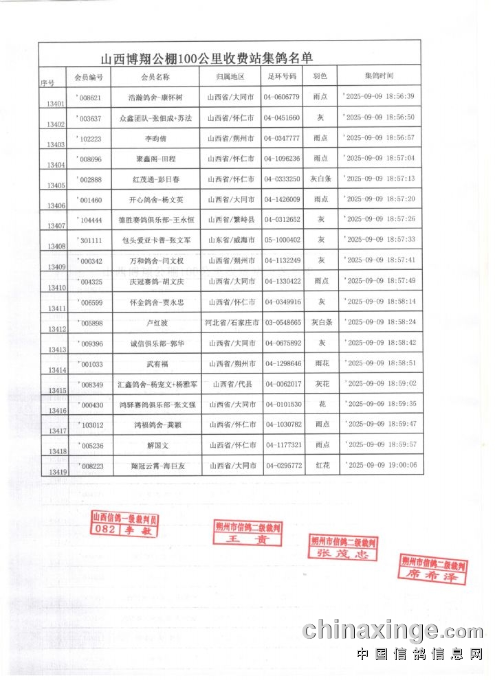 山西博翔赛鸽公棚100公里收费站裁判签字确认