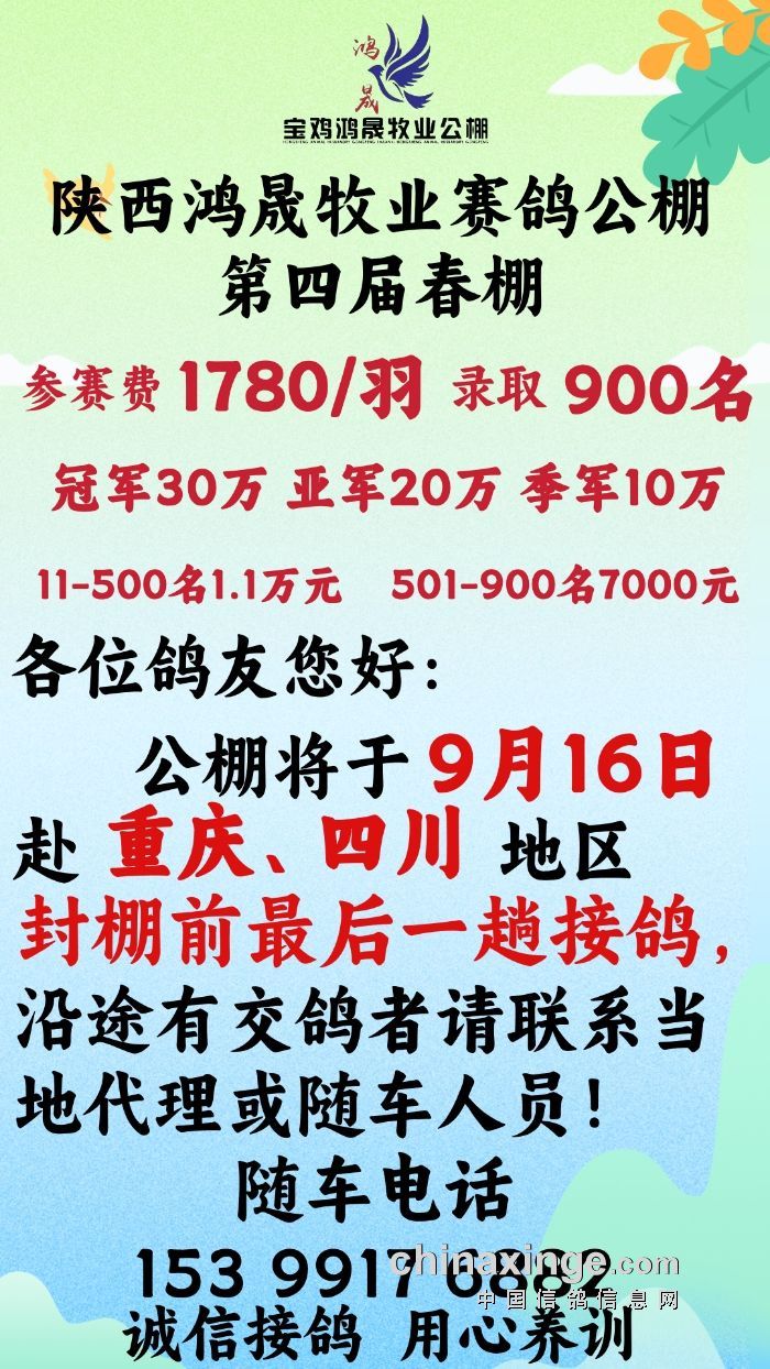 9月16日赴重庆、四川地区封棚前最后一趟接鸽公告