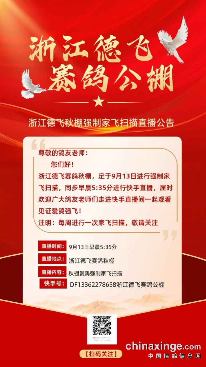 浙江德飞赛鸽公棚9月13日强制家飞扫描公告